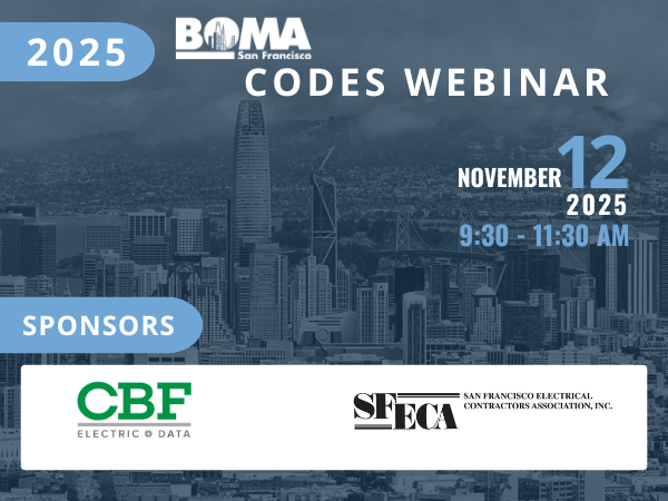 This annual program provides an essential overview of the latest local and state code updates impacting commercial real estate. Our Codes and Regulations Committee, along with key representatives from city agencies and partner organizations, will share insights on new requirements, upcoming changes, and initiatives shaping building operations, safety, and compliance in San Francisco and beyond. Presentations will include updates from Bob Raymer on state code developments, the San Francisco Department of Environment on the Major Renovations Ordinance and Building Performance Standards, the Office of Resilience and Capital Planning on the Concrete Building Inventory Assessment, and the latest updates and key developments from the San Francisco Department of Building Inspection and the San Francisco Fire Department.