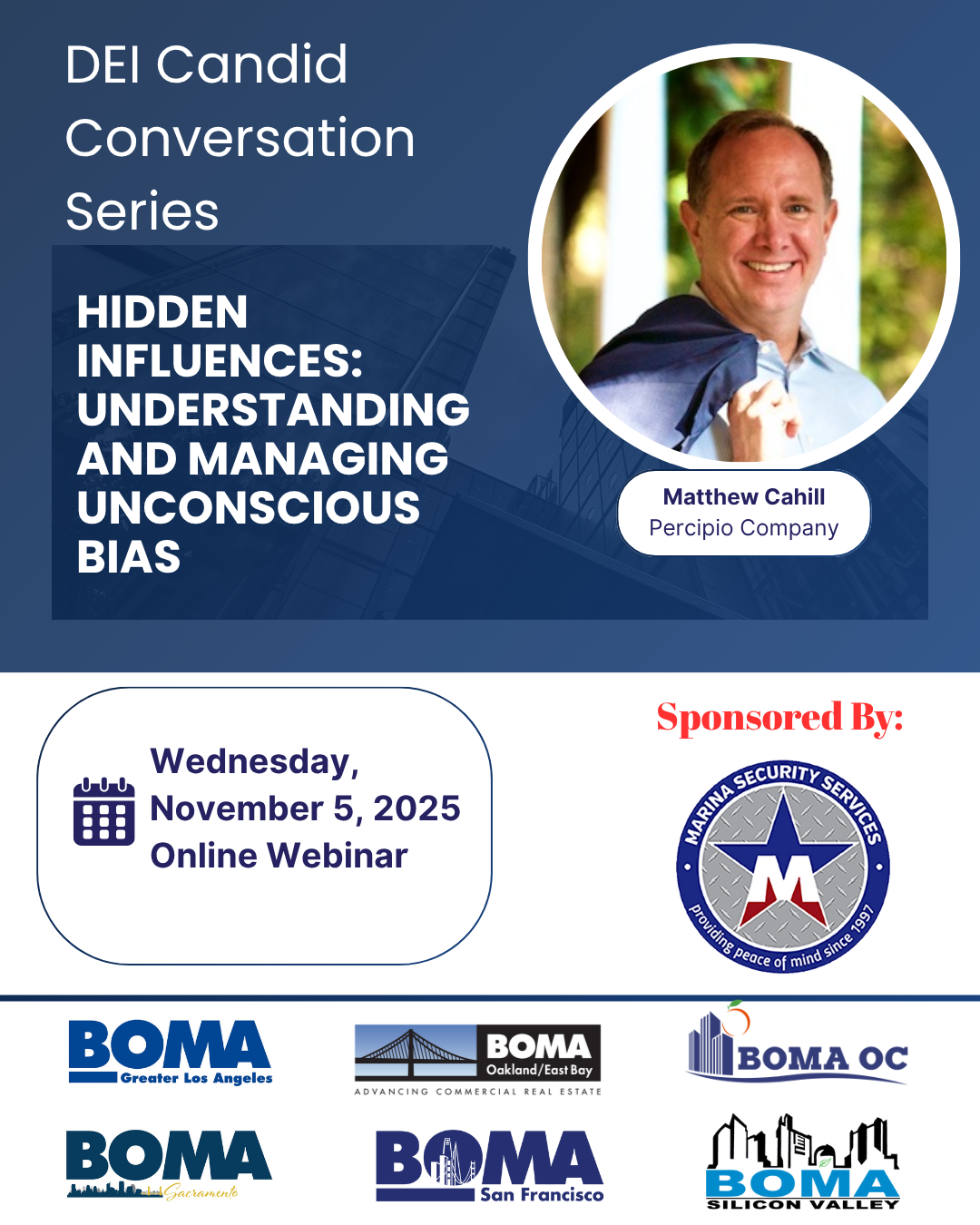 Join us for a thought-provoking statewide virtual event presented in partnership with BOMA San Francisco, BOMA Oakland/East Bay, BOMA Greater Los Angeles, BOMA Orange County, BOMA Sacramento, and BOMA Silicon Valley. Matthew J. Cahill of Percipio Company will lead an engaging, interactive discussion examination on Unconscious Bias and how it effects us.