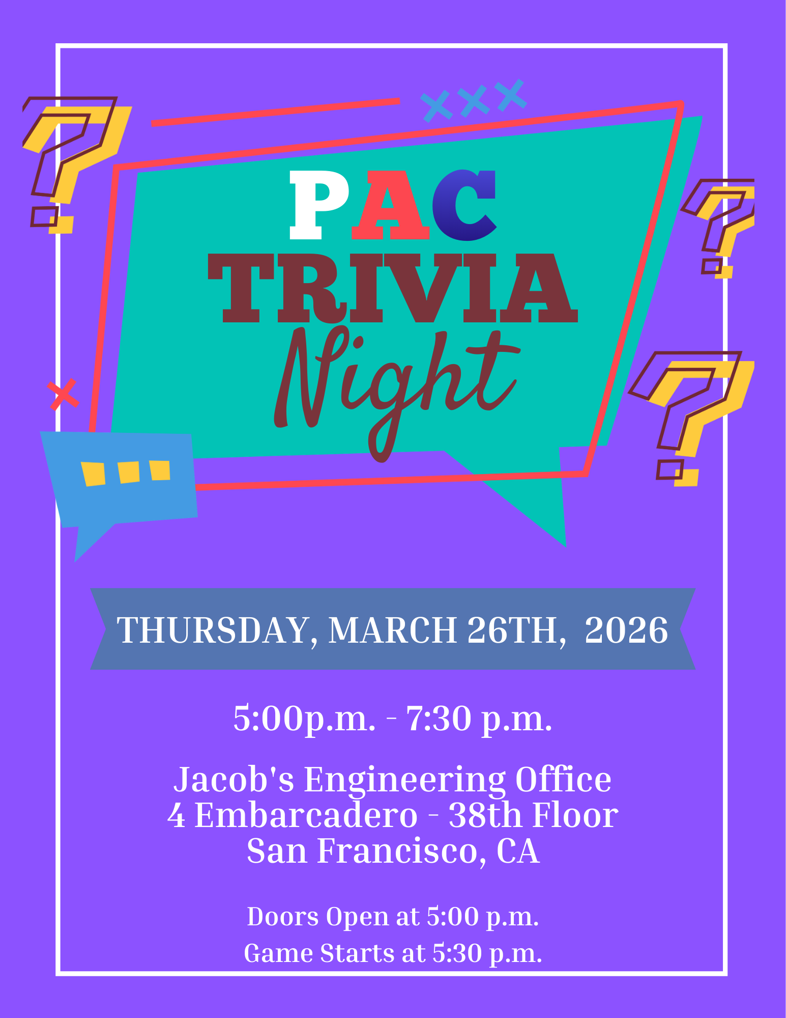 Get ready to flex your brainpower at BOMA-SF PAC Trivia Night—where quick thinking, bold guesses, and bragging rights are all on the line! Fuel up with pizza, rally your team, and prepare for a fast-paced night of friendly (but fierce) competition. Hosted by Maddie Campbell, Manager of Government Affairs, the trivia showdown will cover everything from pop culture and sports to literature, music, social media, and more. Only one team can claim victory....but everyone will have a blast doing it, all while supporting BOMA’s advocacy efforts. Come hungry, come competitive, and come ready to prove you’ve got what it takes. Trash talk encouraged. Cheating strongly discouraged. Don’t miss this high-energy night of fun, networking, and serious bragging rights. See you there!